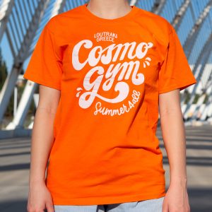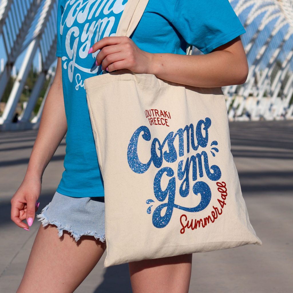 - White t-shirts with colorful or glitter Cosmogym prints — plus an exclusive design printed on the back